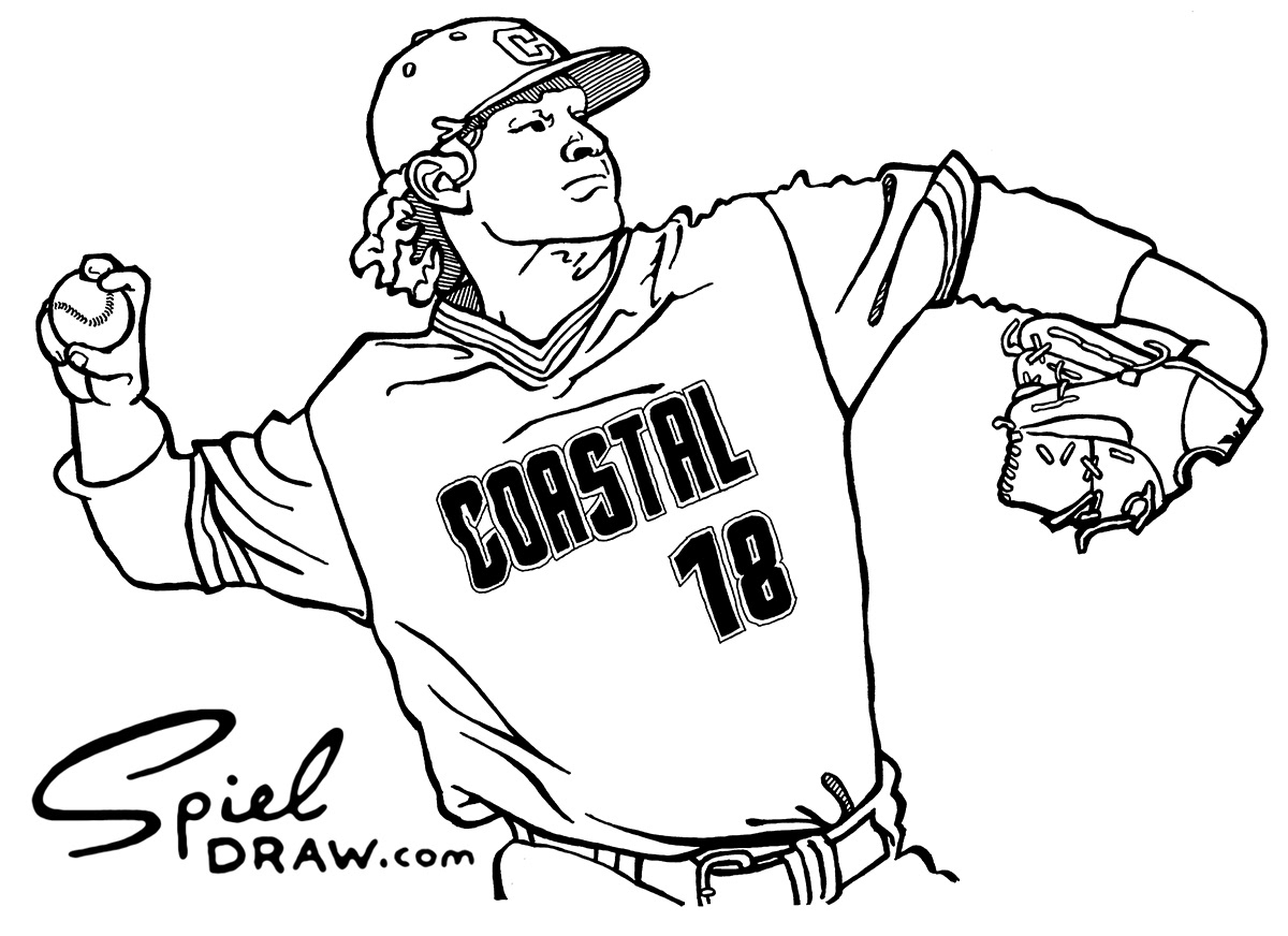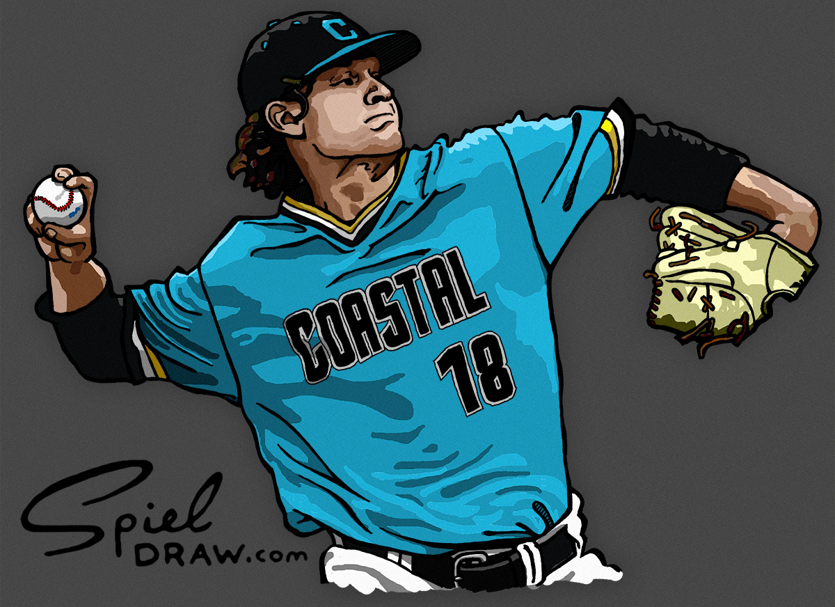 Digital illustration of Coastal Carolina pitcher Alex Cunningham. Created with paper, pencil, ink, and Photoshop.