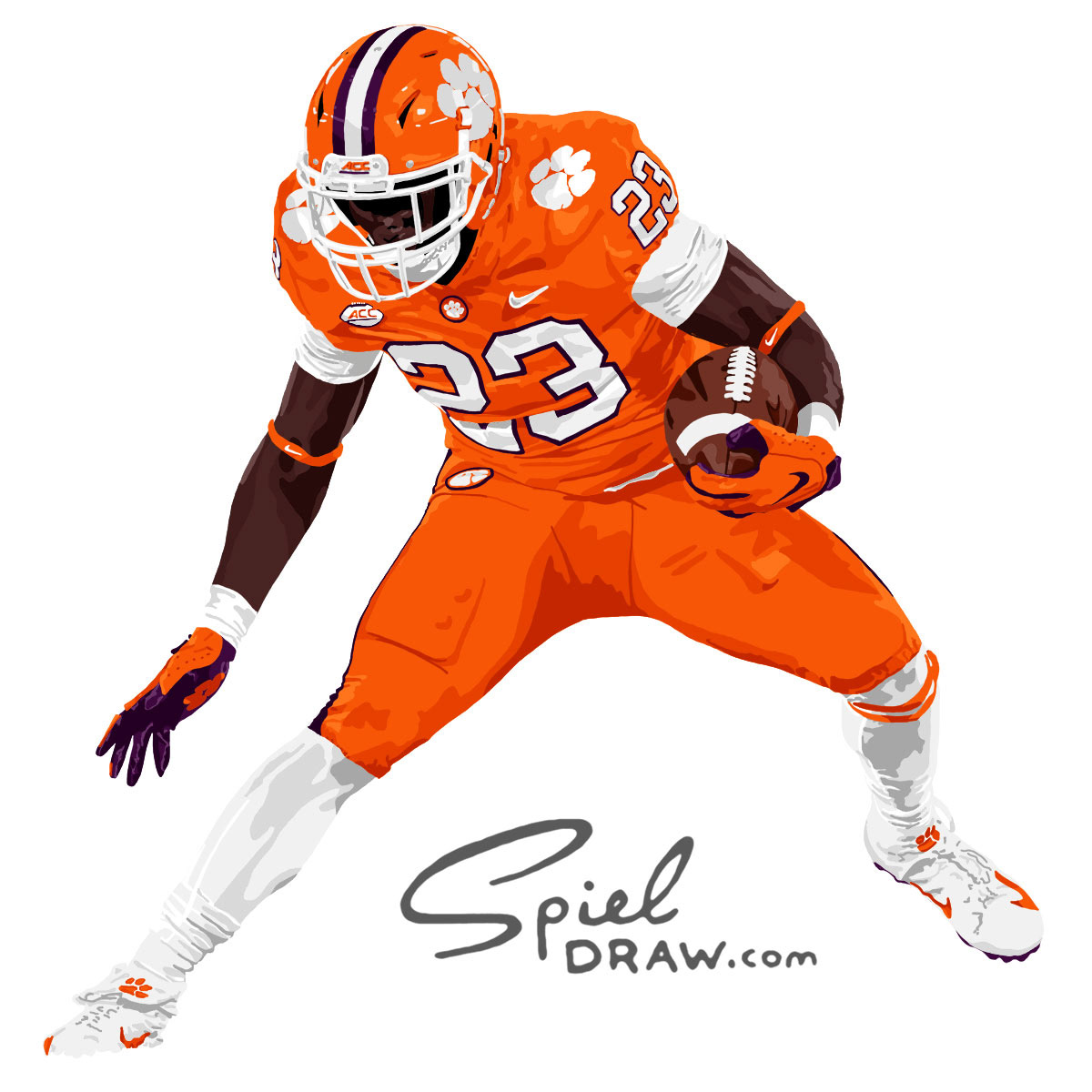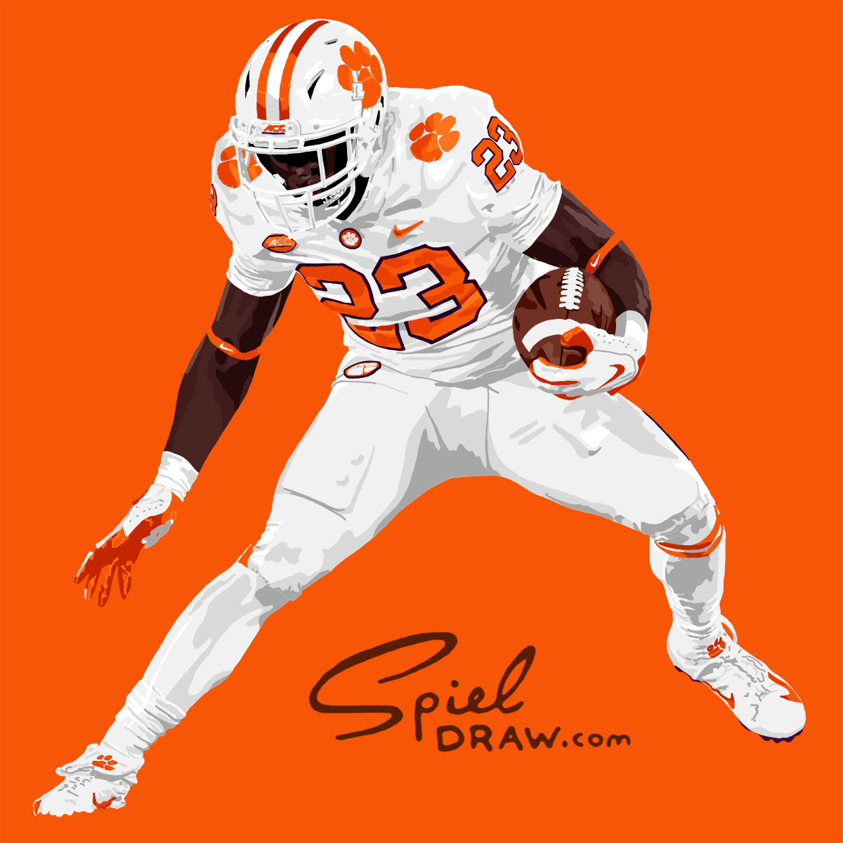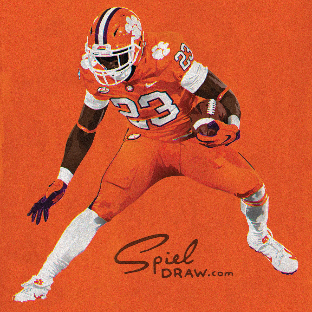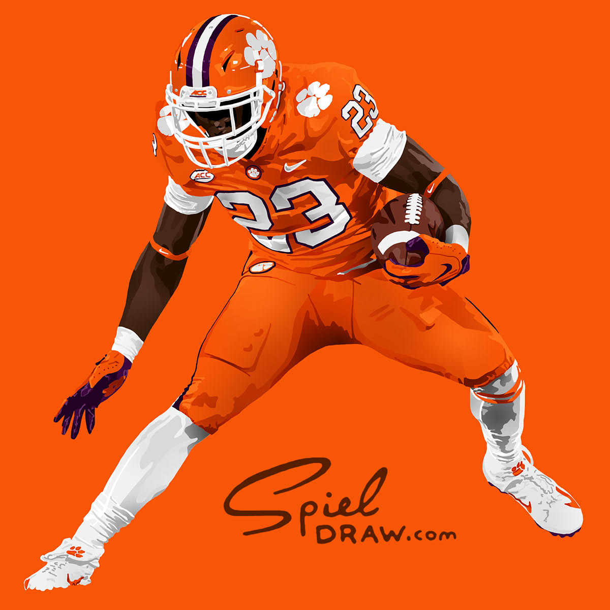 Digital illustration of Clemson running back Lyn-J Dixon. Created with Procreate and Photoshop.